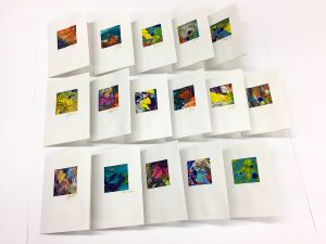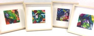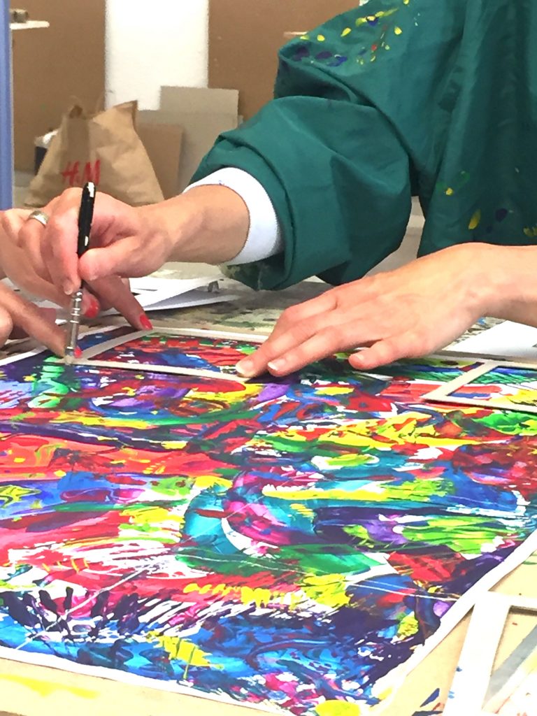 Beim Eintreffen der Gäste war bereits alles perfekt vorbereitet und die Kinder konnten gleich loslegen. Unter fachkundiger Anleitung legten sie los und ließen ihrer Kretivität freien Lauf. Durch gemeinsames Wirken entstanden beeindruckend farbenfrohe Werke, aus denen dann Lesezeichen, Karten und gerahmte Bilder gefertigt wurden. Die Kinder hatten einen Riesenspaß und waren sehr begeistert von ihrer kreativen Ausbeute. Die gute Laune der Kinder war so ansteckend, dass die Eltern beim Abholen am Liebsten gleich dageblieben wären, um selbst mit Farbe und Spachtel tätig zu werden. Danke Frau Brenner, für diesen tollen Nachmittag !“